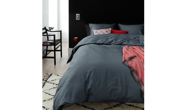 60in duvet cover and 2 pillowcases, 100% plain cotton in anthracite color. Equipped with a zipper. Machine washable and dryable.
