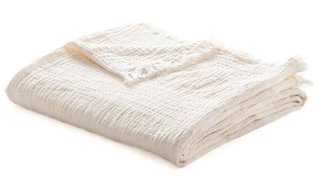 Ivory muslin throw with natural toned linen inserts Nice fringed edge Size: 50' x 60' Made in Portugal 90% cotton muslin - 10% linen Machine washable and dryable