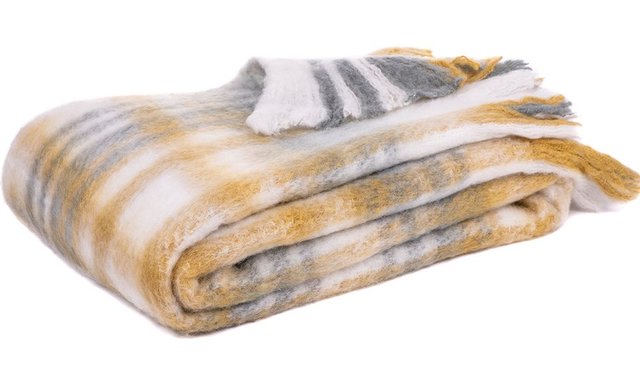 Pale grey, mustard yellow and cream check mohair throw Finished with fringes Size: 50' x 60' 75% acrylic - 25% wool Spot clean only