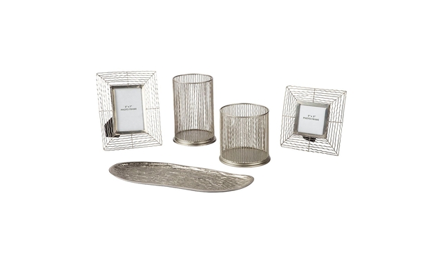 Make some waves with this highly contemporary accessory collection. Wonderfully open and airy, the wavy metal frames and hurricane candle holders beautifully go with the flow. Organic shaped tray is a natural complement.
