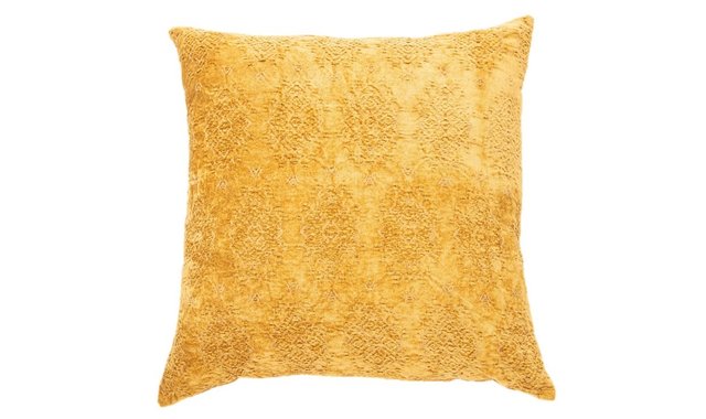 Mustard pattern european pillow Velvet effect on the front Sizes: 25' x 25' 80% viscose 20% cotton cover Polyester filler Zipper closure Machine washable and dryable cover