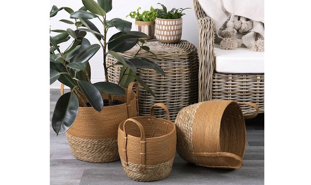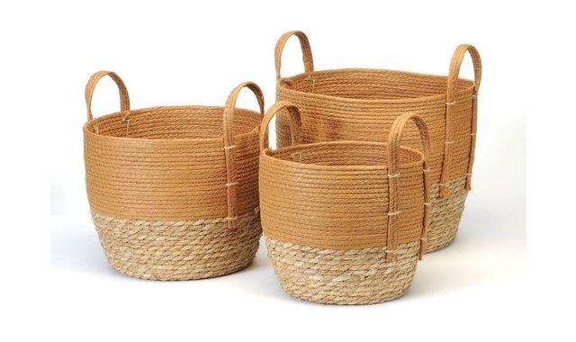 Set of 3 tan and natural colored wicker baskets, available separately, small $ 22.99 / medium $ 32.99 / large $ 43.99. They can be used as a flowerpot for plants or even simply for decorative purposes.