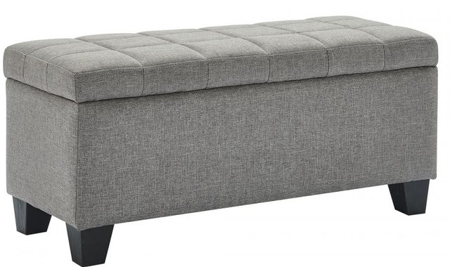Transitional bench with deep storage Textured, polyester fabric upholstery with square tufted top Safety stop hinges keep seat from slamming shut Medium-firm polyester foam cushion Approximate weight capacity is 300 lbs