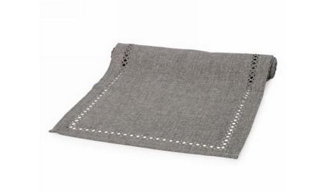 Decorative gray table runner with cut-out pattern. Ideal for a buffet or a centerpiece.