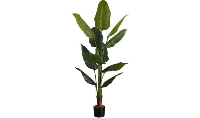 Add nature to your space with this artificial strelitzia tree that stands 59" tall. Housed in a sleek 5" black pot topped with natural moss, this indoor tree adds a touch of greenery to your room without the hassle as there is no need for watering or maintenance! The 11 leaves in beautiful shades of green give a realistic appearance, while the high-quality materials make it durable and eco-friendly. Whether in a contemporary home or a modern office space, beautify your space with a touch of green.