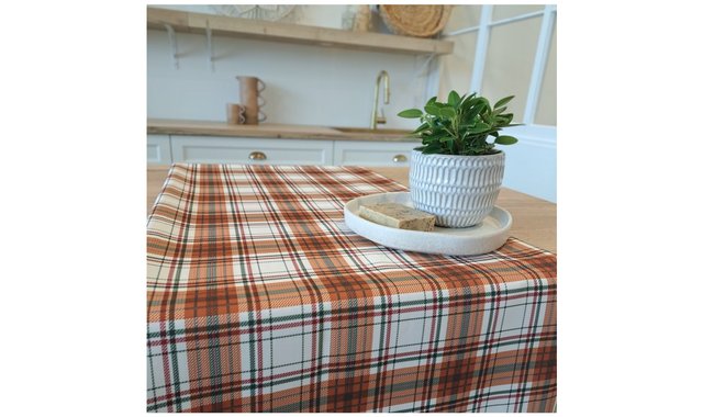 Setting a beautiful tablecloth means setting the table for beautiful moments with those you love. Checked tablecloth in shades of terracotta, green and white From our Kabane brand 4 to 6 people seated: 54'' x 72'' 100% polyester Wrinkle-free Machine washable and dryable