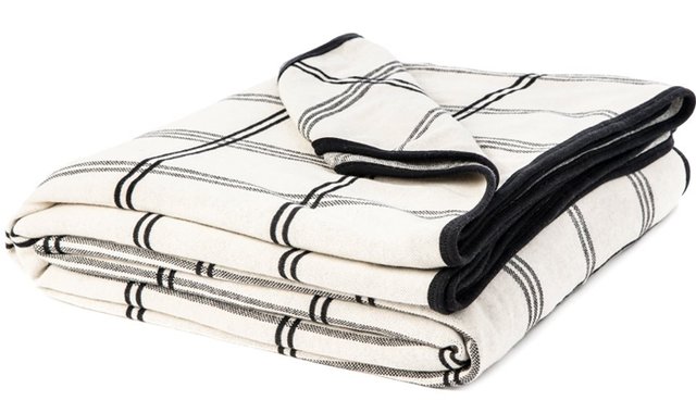Sober, classic and remarkable. Natural black check throw Finished with delicate black border Dimensions: 50'' x 60'' 100% cotton Machine washable and dryable