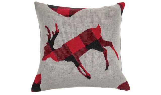 May the holiday season bring joy to your heart and home. Gray cushion with a red and black checkered deer pattern Dimensions: 18'' x 18'' 100% acrylic cover Equipped with a zipper Polyester fill Machine washable cover