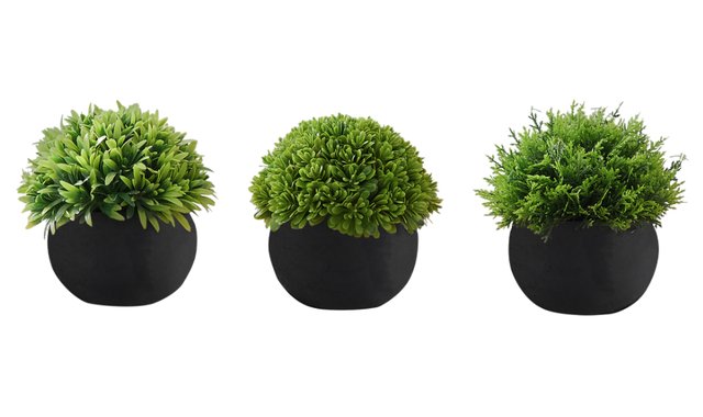 Add a decorative accent for the home or office with our incredible trio of artificial houseplants and bring vibrant greenery to your space. This set of 3 complementary, 5” tall dummy plants is strikingly realistic, firmly set in black pulp pots. Vibrant green foliage requires no maintenance, watering or special lighting conditions. Ecological and long-lasting, this set of potted table plants is ideal for any decorating style. With their realistic look and feel, these decorative faux green plants can be placed on any surface without fear of water marks or messy falling leaves. For indoor use only and with no assembly required, our pretty trio of dummy plants is sure to brighten up any shelf or table without worrying about lighting conditions. A 5-year limited warranty against manufacturing defects is included for these artificial indoor plants, which will stay fresh for years.