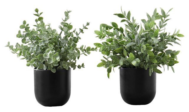 Our artificial plants offer a perfect, carefree way to add a touch of greenery to your living space. This set includes two 11” tall artificial eucalyptus grass plants. They offer a unique, fresh look with no maintenance required. Both plants feature adjustable leaves to give a full, lush look to the pox-green leaves that look and feel very real. They are installed in 5” black pots that can be placed on any surface without the need for cleaning. This set is perfect for bringing a decorative accent to any home or office without the hassle of watering, wilting or light conditions. Eco-friendly and durable for a sleek, contemporary look that lasts, this duo of indoor artificial plants is a practical way to enhance your environment.