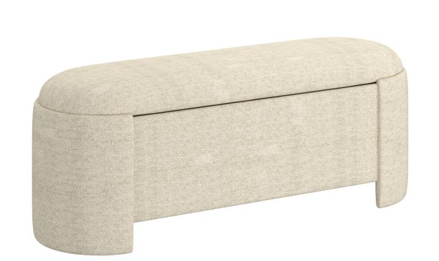 Modern oval-shaped storage ottoman Deep storage compartment with safety-stop hinges on lid Soft textured fabric upholstery Medium comfort polyester foam cushion Approximate weight capacity is 300 lbs Dimensions: 50 x 17.5 x 17.75"H Q