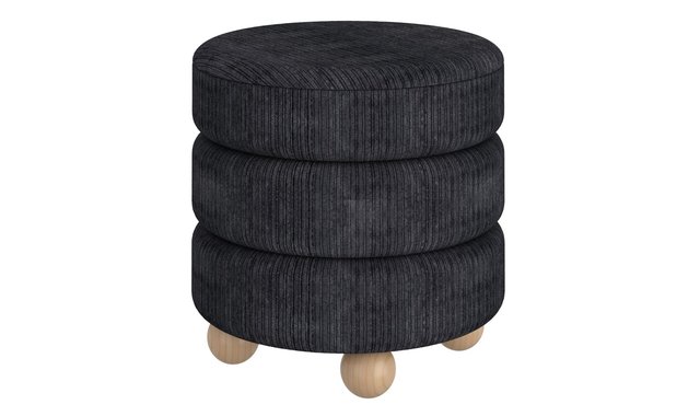 Modern round ottoman Luxuriously soft and plush channelled fabric upholstery Solid wood spherical feet in a natural wood finish Medium comfort polyester foam cushion Approximate weight capacity is 200 lbs Dimensions: 16.5" Dia. x 16.5"H