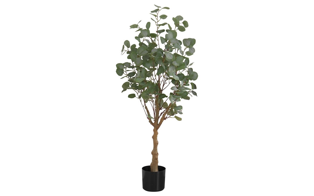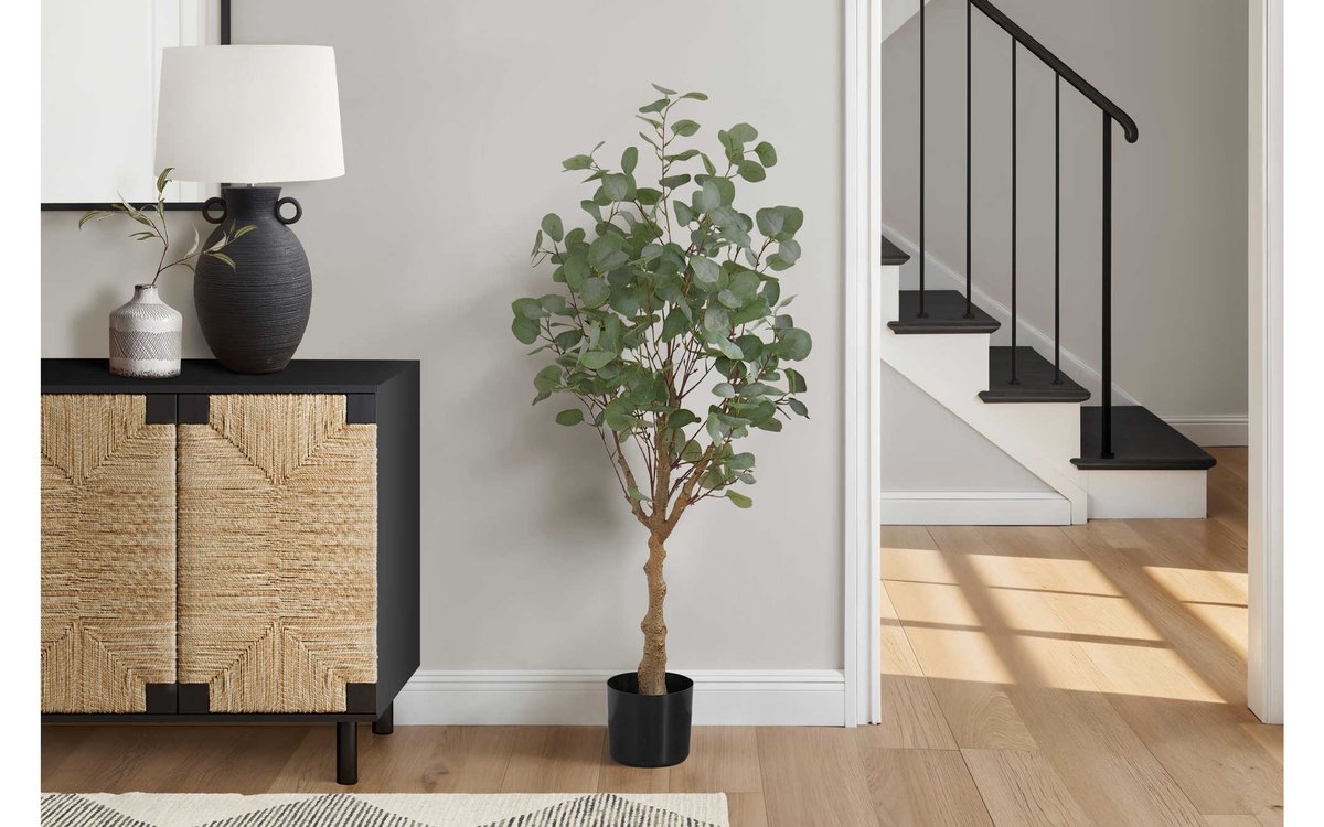 This 46-inch tall artificial eucalyptus tree is perfect for home or office. The 264 leaves designed with high-quality material and green color with a silky feel and adjustable branches offer a realistic look and easy maintenance without watering! This 5-inch tall black potted faux greenery is not only a great decorative accent, but is also durable and environmentally friendly and will last for years without needing to be replaced due to over- or under-watering. Enjoy the beauty of nature without the hassle of maintenance with this room-brightening artificial eucalyptus tree.