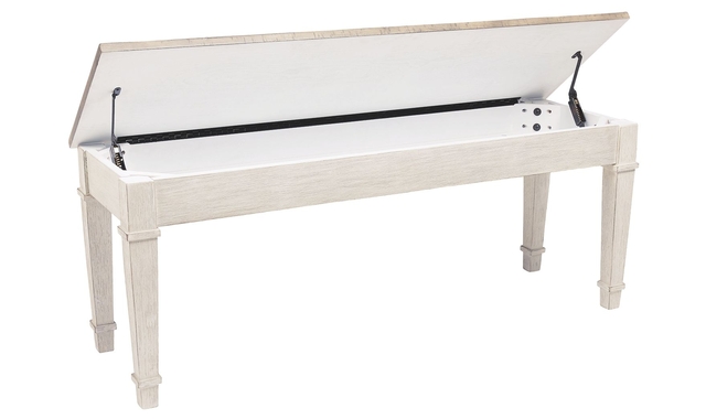 This bench invites you to strike a note for small space living. An inspired choice for coastal chic or modern farmhouse settings, this piano style bench with under seat storage sports a grayish white finish with rub through effect for timeworn appeal.