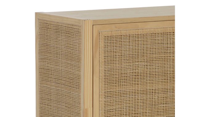 Combining modern style with practicality, this marvelous highboard features a stellar design suitable for any space. Crafted with natural rattan with tone-on-tone coloring. Includes a double cabinet with lower shelf for storage. Completed with solid pine legs.