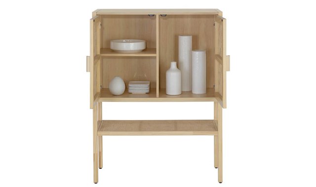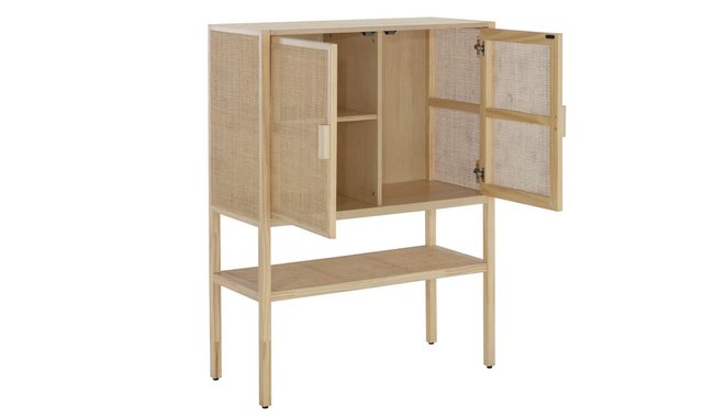Rich with texture, this modern highboard will add personality to any space. Crafted with natural rattan with tone-on-tone coloring. Includes a double cabinet with a lower shelf for storage. Completed with solid pine legs.