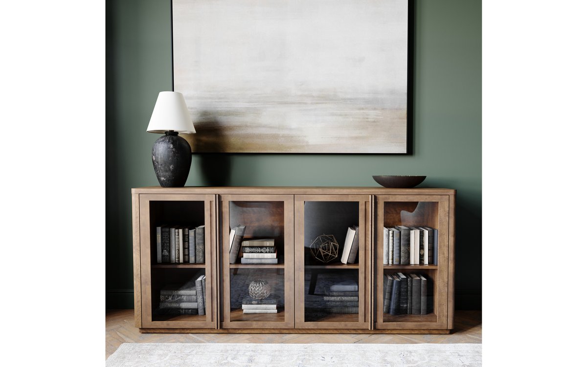 Be captivated by this magnificent modern sideboard with glass doors, a centerpiece with a clean and refined design. Crafted from solid wood, this piece is distinguished by its crisp lines, wooden handles, and the addition of glass to the front. Whether intended for your dining room, living room, or even your entryway, this sideboard integrates perfectly into a variety of spaces.