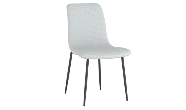 Modern faux leather-upholstered dining chair Hexagon-stitch detailing on chair seat and back Metal legs with a matte black finish Firm polyester foam cushion Approximate weight capacity is 250 lbs; seat height is 17.75" Dimensions: 19 x 23.75 x 32"H