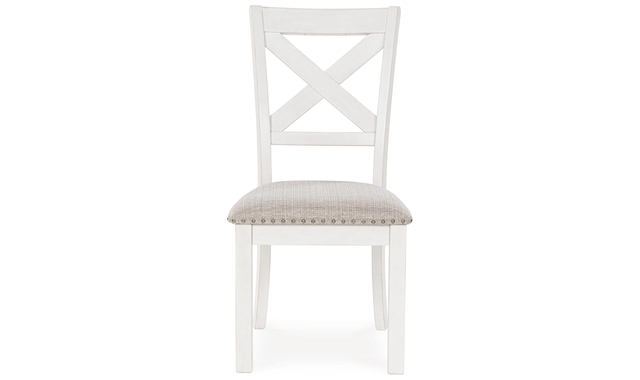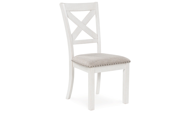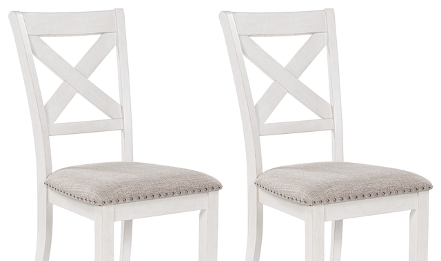 This dining chair is sure to impress come mealtime. With its antiqued white finish, classic country X-back and light gray upholstery with nailhead trim, modern farmhouse-style dining has never been so fashionable. All that's missing is you and your family.