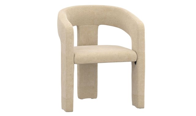 Modern bucket-style dining chair Plush, textured chenille fabric Fully upholstered with three-leg design Medium-soft comfort polyester foam cushion Approximate weight capacity is 300 lbs; seat height is 17.75" Dimensions: 23.25 x 21.75 x 29.5"H