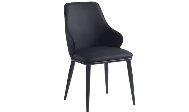 Modern armchair with metal frame Contoured seat back with faux leather upholstery Metal legs with a matte black finish Medium-firm comfort polyester foam cushion Approximate weight capacity is 300 lbs; seat height is 19.5" Dimensions: 24 x 19 x 34"H