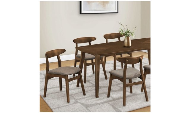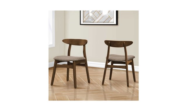 Chairs (2) - Brown walnut wood & beige fabric Elevate your dining experience with our trendy and stylish set of 2 dining chairs. Designed for everyday casual family dining and entertaining, these side chairs are both comfortable and durable with padded foam cushioning upholstered with soft beige fabric. Crafted with sturdy construction, these dining chairs feature angled solid wood legs in a rich dark walnut finish that add a touch of elegance to your kitchen or dining room. The ergonomic friendly, curved solid back design offers ample support while enjoying a meal or engaging in lively conversation around the table. Easy to assemble with illustrated instructions included, pair these mid-century modern and fashionable style dining chairs with a matching dining table (sold separately) to totally refresh your dining space. Backed by a 2 year limited warranty against any defects, you can trust in the quality and longevity of this product.