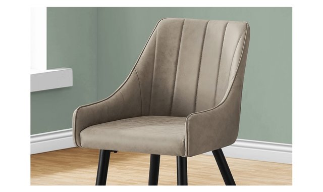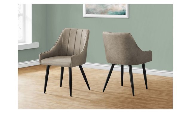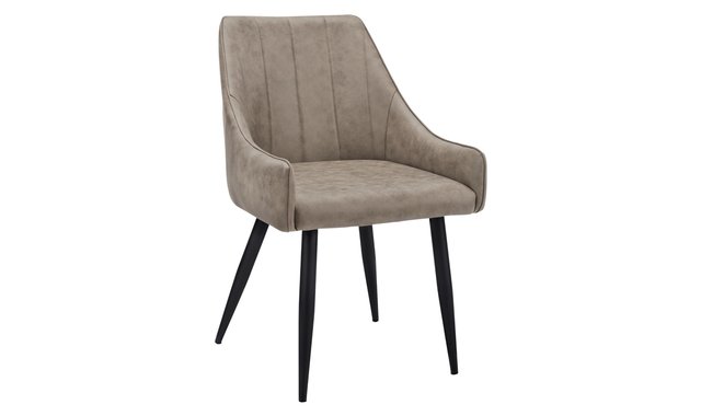 You'll want to remain seated at the table in these supremely comfortable upholstered dining chairs in a taupe distressed leather-look fabric. With vertical channel tufting for a luxurious feel, the padded back and sides curve around the seat and slope down to form low, integrated armrests. The cushioned seat is deep and generously padded for ultimate support. Angled and tapered black metal legs add a modern look. This stylish chair is ideal for an eat-in kitchen or formal dining room, or as an accent chair in other rooms. Dining chair upholstered in a taupe distressed leather-look fabric with vertical tufting. Features low armrests, a cushioned seat, and a padded back for comfort and support. Tapered metal legs in a black finish.