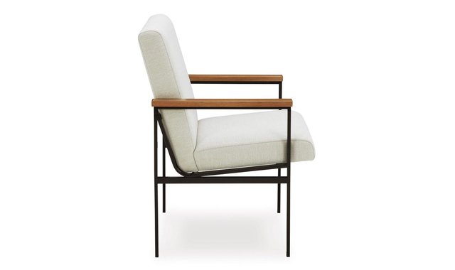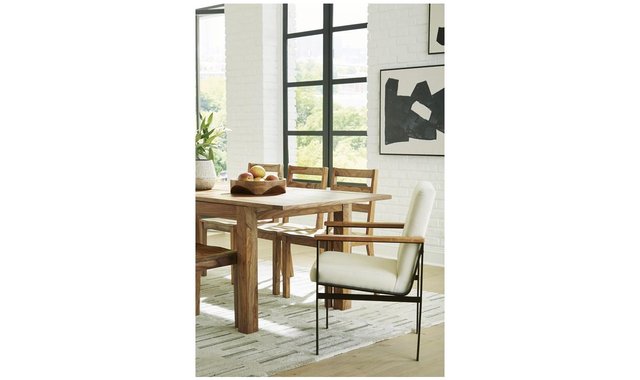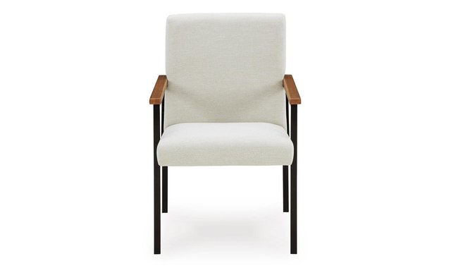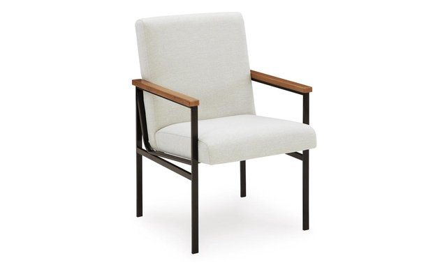 Discover something extraordinary with this upholstered dining arm chair. Its wood armrests are paired with a black metal frame for a clean-lined contemporary appeal. Strikingly simple, this piece creates an understated, modern feast for the eyes whether it’s used for dining or when friends drop by to hang.