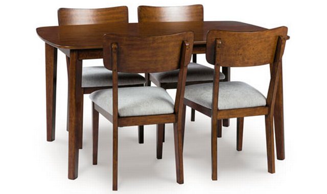 A refreshed take on retro aesthetics. This table and chairs set adds an air of playful simplicity to your dining space, capturing the architectural language of mid-century stylings. Subtly dynamic in design, it invites the eye with its curved backrests and contrasting light gray cushions. A casual, yet timeless, finish on the table and chair frames completes this study in form and function.