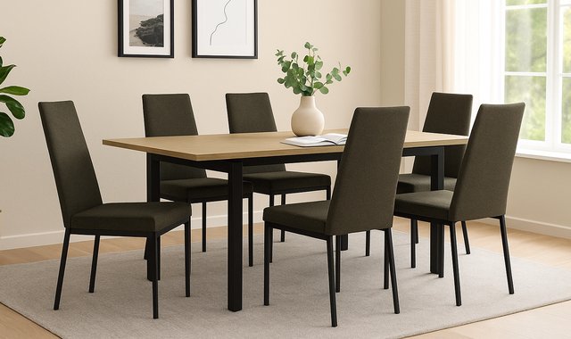 What makes this 7-pc dining room set with metal base and imitation concrete extendable top so distinctive? Its top that seems to float in space, or the leaf system that doubles its seating capacity? Either way, Zoom will give you a place to capture happy memories in time.