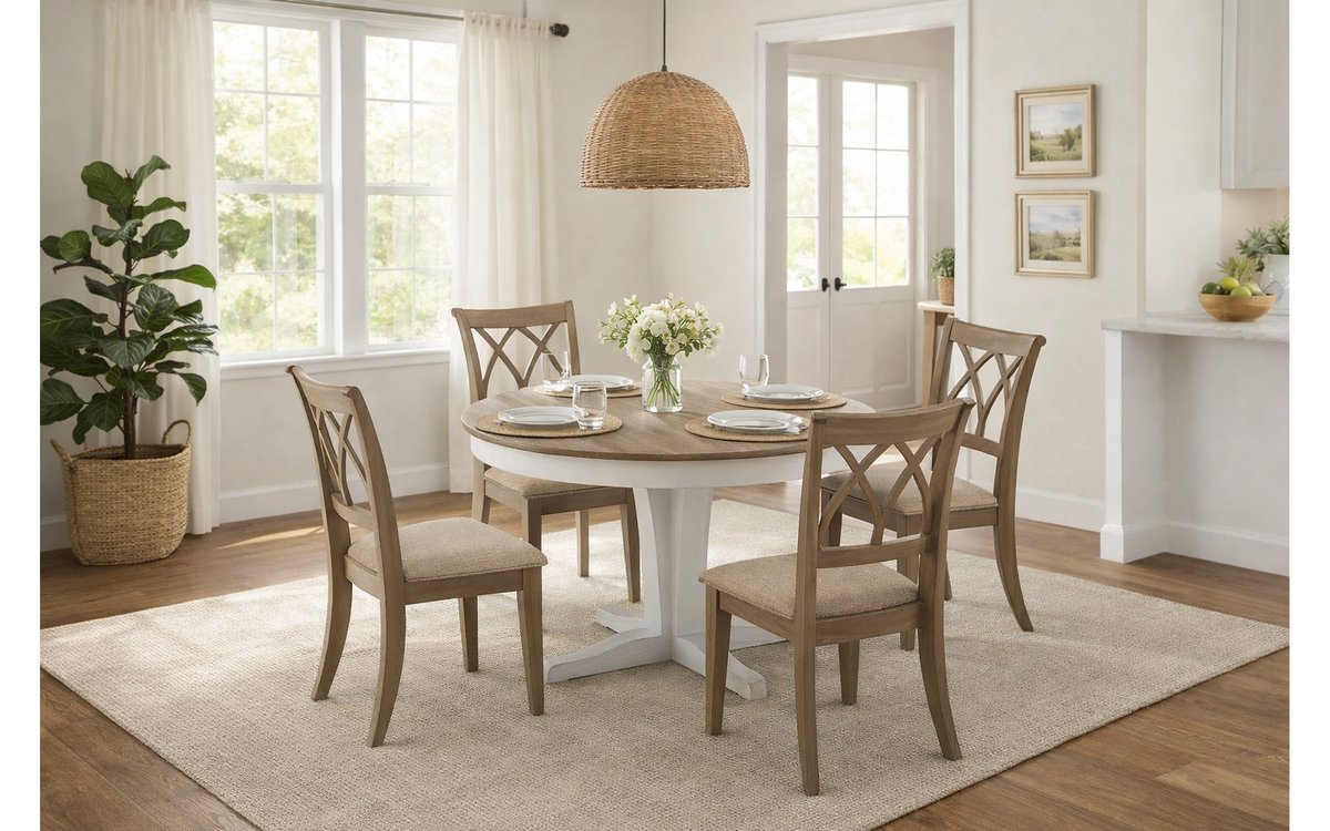 5-piece quality solid birch table dining room set with a round table with a white base, arranged with 4 traditional-style chairs that will enhance your dining room, while offering comfort.