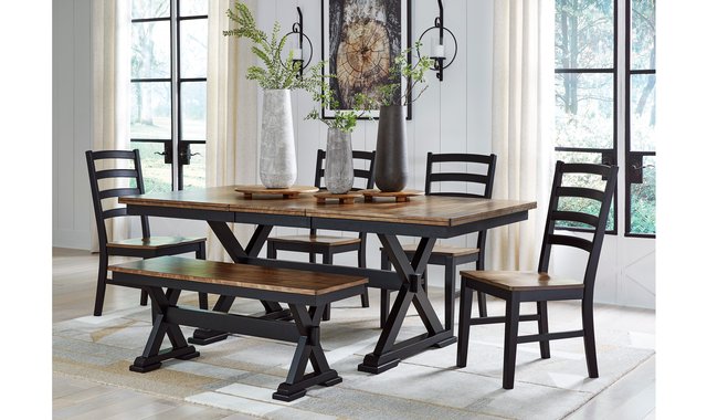 Raise the bar on modern farmhouse style with this dining extension table. Its handsome good looks are accentuated with a two-tone finish and a casual butcher block veneer top. The sturdy silhouette adds a hearty element, whether your style is vintage, country or eclectic. This richly crafted multi-use table extends to seat eight comfortably, serving up charm wherever folks decide to take a seat. - Includes table, 4 chairs and a bench
