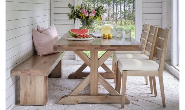 This imposing solid wood bench reveals a simple and natural look that will bring warmth and conviviality to your room + a magnificent table that will certainly be a favorite. With its rustic look and spectacular crossed legs, it will completely enhance the decor of your dining room. Opt for round or rectangular depending on your space and the desired effect, 2 chairs Featuring a ladder back, this chair stands out thanks to its massive horizontal bars which give it a rustic and original touch.