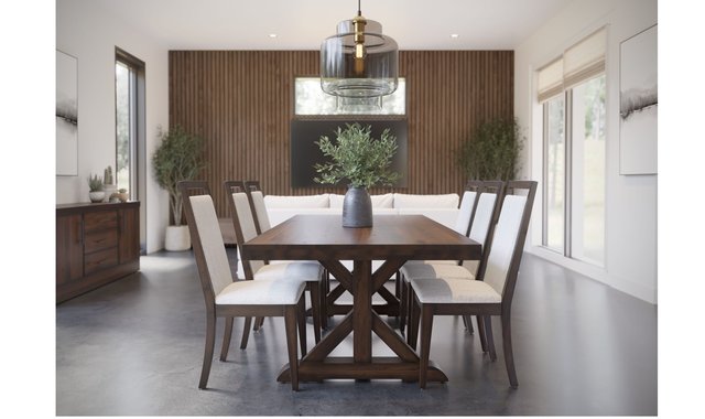 Customizable dining room set made in Canada. Wide variety of finishes and configurations available. Includes table and 6 chairs