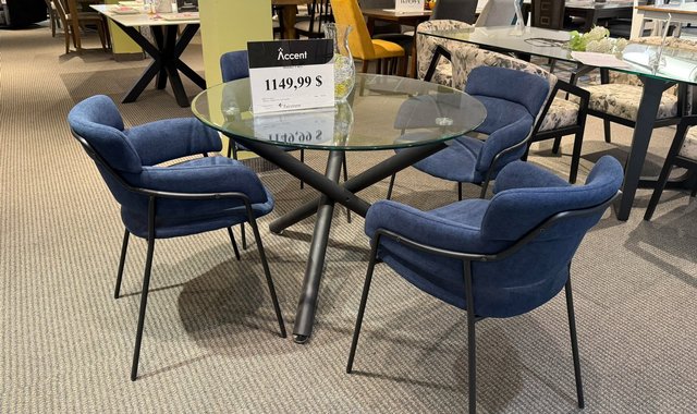 Elevate your dining space with this sleek and stylish set by Worldwide, blending contemporary design with everyday comfort. This 5-piece dining set features a striking combination of a round tempered glass table and four upholstered chairs in a rich navy blue. Designed for both aesthetics and functionality, it’s ideal for modern homes and open-concept spaces. Table Features: • Top: Clear tempered glass for a refined, airy look • Base: Black metal cross-style legs for a bold architectural touch • Style: Modern, minimalist, and timeless Chair Features: • Upholstery: Soft, textured navy blue fabric that’s on-trend and cozy • Frame: Matte black metal with integrated armrests for extra support • Comfort: Curved backrest and padded seat for long-lasting comfort