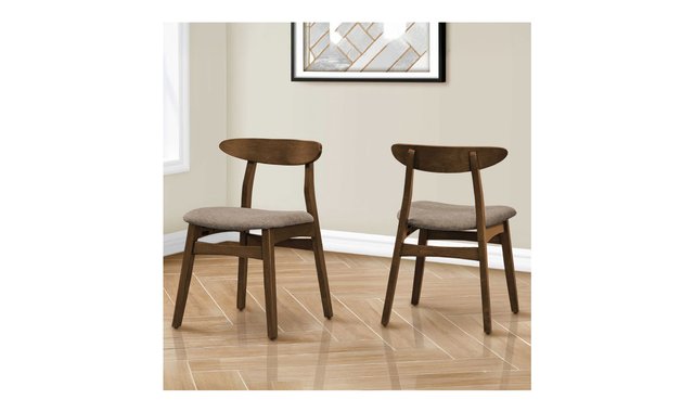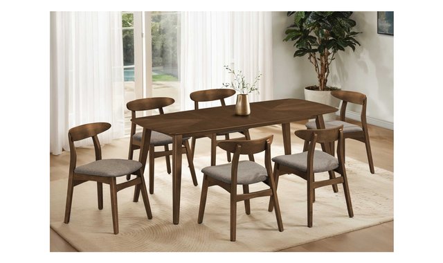 7-pc Dining Set Dining Table - Walnut brown wood Bring a touch of mid-century flair to your dining room or kitchen with this fashionable 70.75 inch rectangular dining table. Crafted with a dark walnut veneer top and solid wood angled legs, this durably designed piece is perfect for casual family dining, easily seating up to 6. The easy to clean top ensures that mealtime messes are a breeze to wipe away. The easy to assemble illustrated instructions makes setting up this stylish dining table a cinch. Backed by a 2 year limited warranty, you can trust in the quality of this sleek addition to your home. Pair this table with some matching chairs (sold separately) and upgrade your space with this fashionable style dining table today! Chairs - Brown walnut wood & beige fabric Elevate your dining experience with our trendy and stylish set of 2 dining chairs. Designed for everyday casual family dining and entertaining, these side chairs are both comfortable and durable with padded foam cushioning upholstered with soft beige fabric. Crafted with sturdy construction, these dining chairs feature angled solid wood legs in a rich dark walnut finish that add a touch of elegance to your kitchen or dining room. The ergonomic friendly, curved solid back design offers ample support while enjoying a meal or engaging in lively conversation around the table. Easy to assemble with illustrated instructions included, pair these mid-century modern and fashionable style dining chairs with a matching dining table (sold separately) to totally refresh your dining space. Backed by a 2 year limited warranty against any defects, you can trust in the quality and longevity of this product. This set includes: 1x 72” table 3x Set of 2 chairs Additional items shown in image are extra.