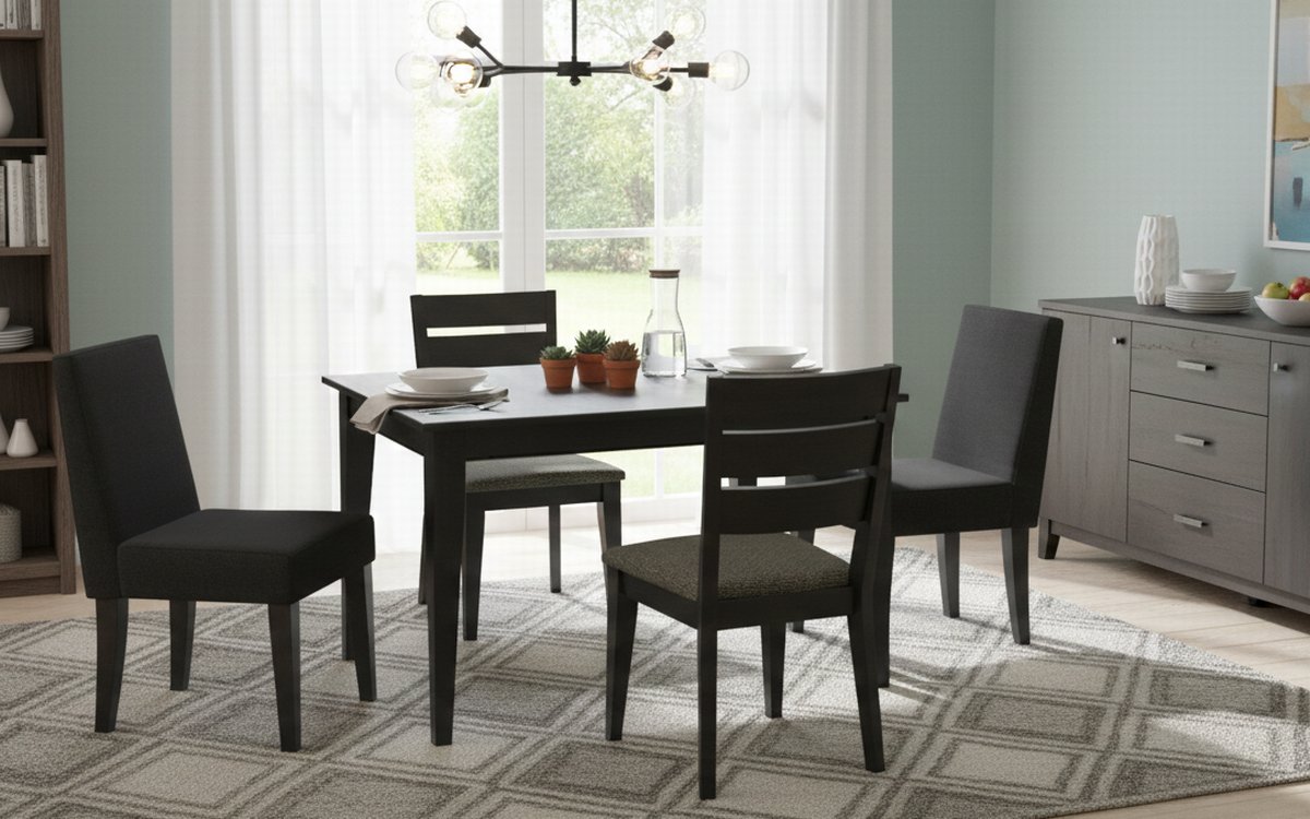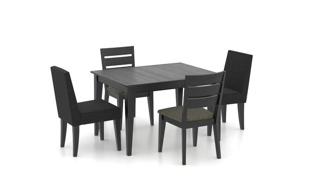 This Canadel dining set stands out for its harmonious blend of styles and uniform color. The solid wood table is finished in dark black with clean lines, bringing a warm, contemporary touch to the space. The ensemble creates a sophisticated, welcoming ambience, perfect for convivial dining while also being a stylish decorative element in any modern dining room.