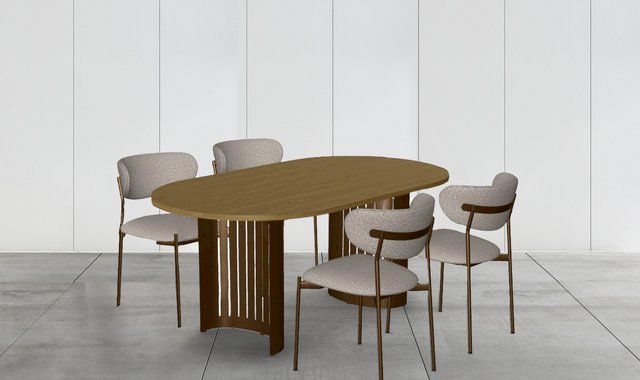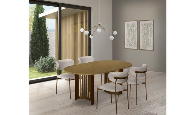 Amisco Rachel dining set, featuring an oval table and four upholstered chairs. The sleek table boasts a contemporary design with its clean lines and oval shape, perfect for family meals or gatherings with friends. The four matching chairs provide superior comfort with their generous padding and ergonomic backrests. Crafted with high-quality materials, this set adds a touch of sophistication to any dining space.