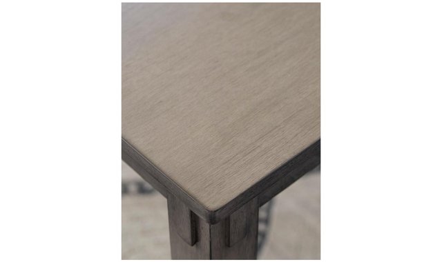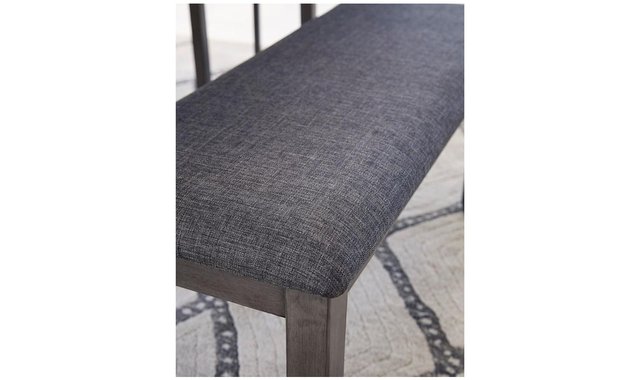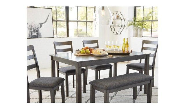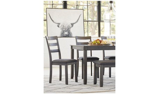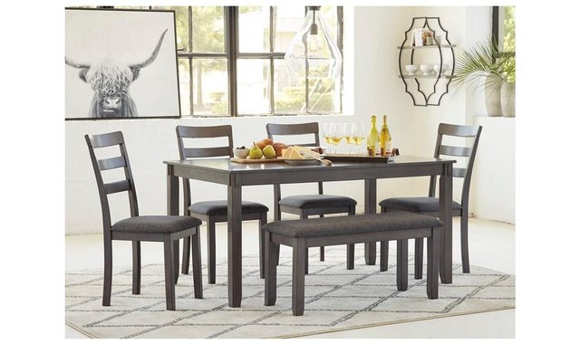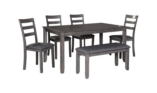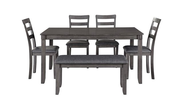 | Additional Information | • Includes dining table, bench and 4 dining chairs • Made of wood, veneer and engineered wood • Medium charcoal gray finish • Ladderback chairs • Cushioned seats covered in textured gray polyester upholstery • Table with tapered leg design • Apron to floor: 26.5" • Seat width: 16.88" • Seat depth: 16" • Seat height: 19" • Bench: 38"W x 15"D x 19"H |