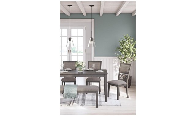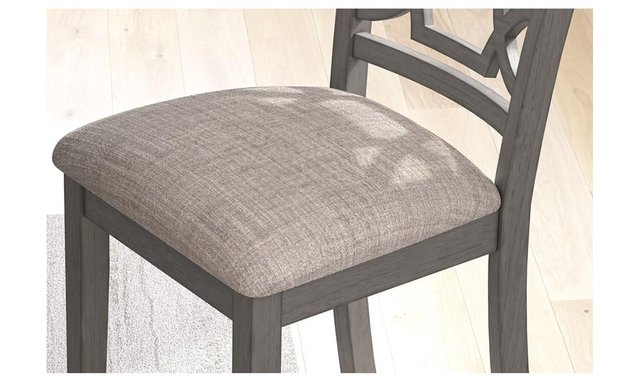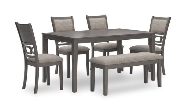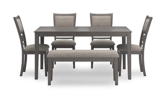 | Additional Information | • Includes dining table, 4 upholstered chairs and bench • Table made with rubberwood solids, mindi veneer and MDF substrates • Chair and bench made with solid wood and engineered wood • Light gray finish • Chair and bench with light gray textured polyester upholstery • Foam cushioned seat and backrest • Chair backrest features fretwork accent • Tabletop has reverse diamond patterned veneer • Table with tapered legs • Seats up to 6 • Apron to floor: 27" • Seat width: 17.38" • Seat depth: 15.88" • Seat height: 19.5" • Bench: 42"W x 14.5"D x 19.13"H |