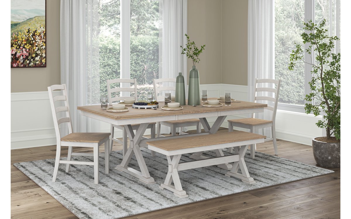 Busy breakfasts and family dinners get a dose of modern farmhouse flair with this dining bench. Its two-tone finish contrasts a light butcher block hue with antiqued white for an utterly charming effect. An effortless seating solution, the bench can tuck under your table to give you extra space to maneuver through the dining room. Made with solid wood frame Seat with light butcher block oak veneer Frame with antiqued white finish