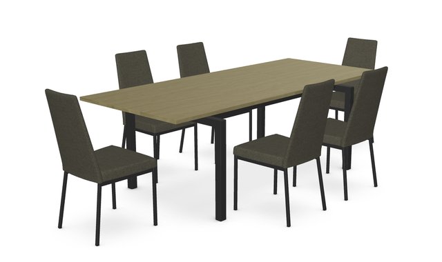 What makes this 7-pc dining room set with metal base and imitation concrete extendable top so distinctive? Its top that seems to float in space, or the leaf system that doubles its seating capacity? Either way, Zoom will give you a place to capture happy memories in time.