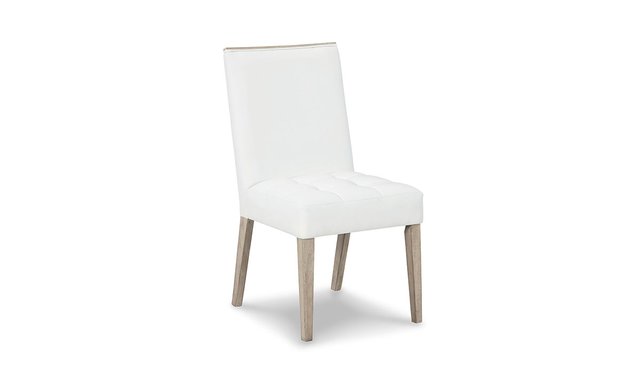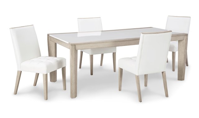Dress your dining space in exceptional style with this dining room table. Its two-tone styling, featuring a light bisque wood finish and glossy white acrylic tabletop insert adding the wood frame chairs upholstered in white crisp vegan leather hit just the right tone for a crisp, contemporary look. A modern design and sleek aesthetic make for a refreshing new look.