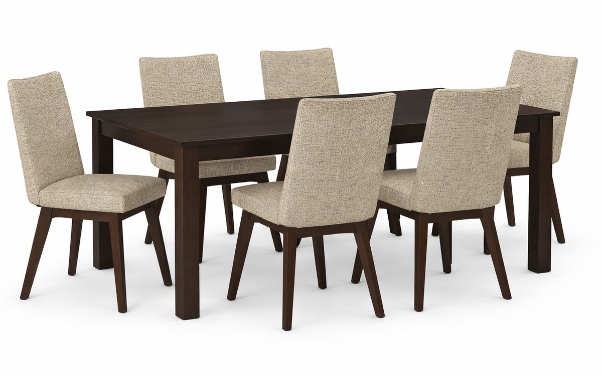 6-piece dining room set: A table measuring 38 inches wide by 60 inches long with a 16-inch extension. The set also includes 6 chairs with solid cherry wood legs.