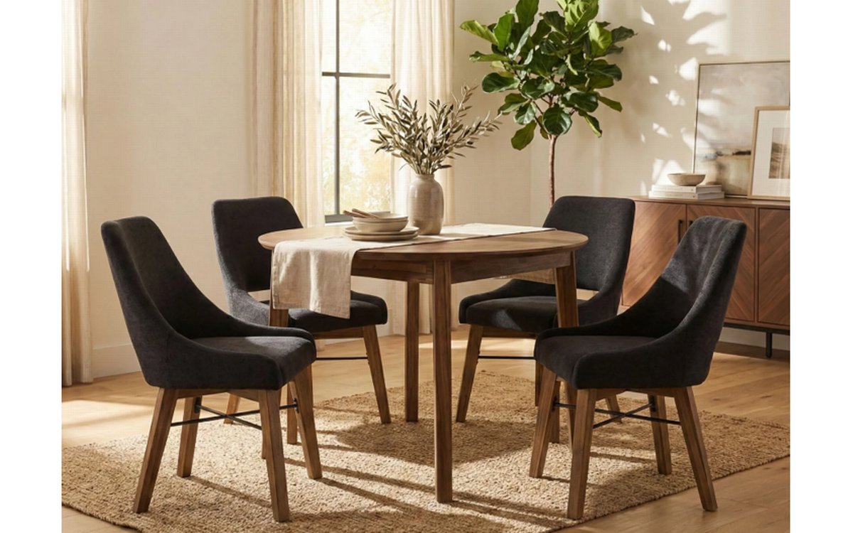Designed for compact living, this round dining table is crafted from solid acacia wood and finished in a warm pecan tone that adds depth and natural warmth to the space. The smooth, round silhouette supports intimate dining arrangements while maintaining visual openness in smaller interiors. Round shape supports easy circulation and flexible seating. Constructed from solid acacia wood for durability and everyday use. Warm pecan finish adds depth and tonal richness.