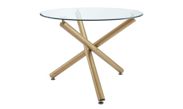 Fun, contemporary design 10mm clear, tempered glass top with brushed stainless steel accent Metal legs with a brushed gold finish Crossover design provides sturdy support Mix and match with a variety of chair styles
