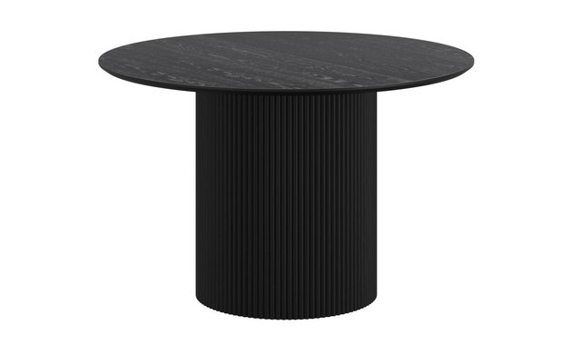 Mid-century modern round dining table Wide pedestal, engineered wood base with reeded detail Engineered wood table top with oak veneer Reverse bevel table top with visible wood grain finish Mix and match with a variety of chair styles and finishes Dimensions: 47.25" Dia. x 30"H