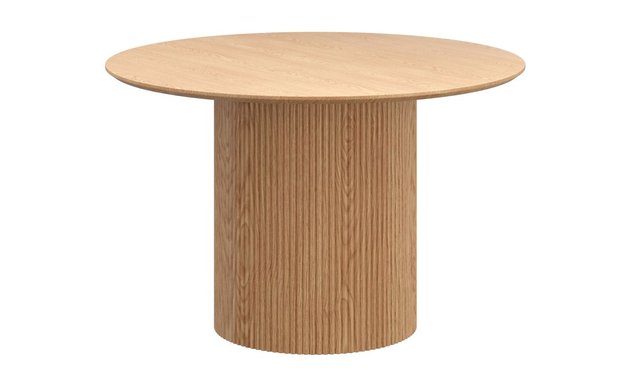 Mid-century modern round dining table Wide pedestal, engineered wood base with reeded detail Engineered wood table top with oak veneer Reverse bevel table top with visible wood grain finish Mix and match with a variety of chair styles and finishes Dimensions: 47.25" Dia. x 30"H