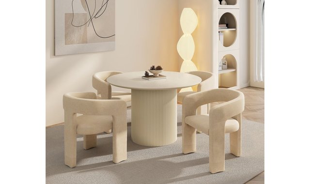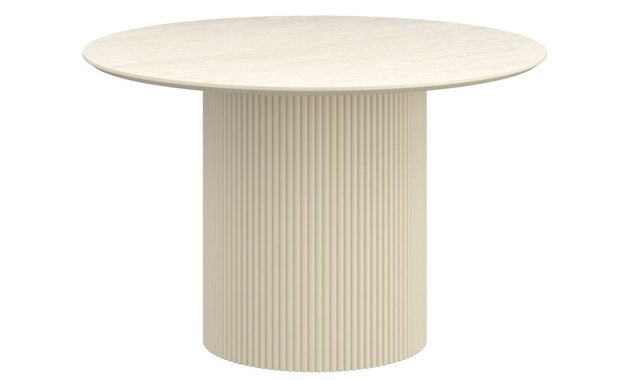 Mid-century modern round dining table Wide pedestal, engineered wood base with reeded detail Engineered wood table top with oak veneer Reverse bevel table top with visible wood grain finish Mix and match with a variety of chair styles and finishes Dimensions: 47.25" Dia. x 30"H