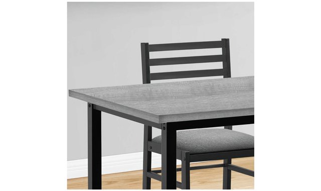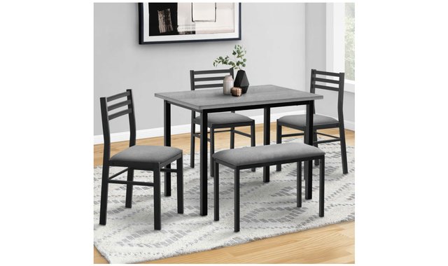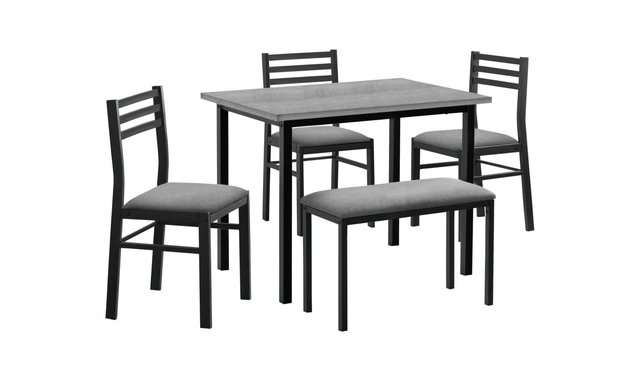 Transform the look of your dining space with this contemporary 5-piece grey and black dining set. This dining set includes a 40" long rectangular table, three chairs, and a bench that accommodates up to 4 people making it perfect for casual family dining. The easy to clean smooth, grey laminate tabletop and its space saving design makes it suitable for a small kitchen or dining room. The black metal frame on the table and chairs ensures a sturdy construction, while the comfortably cushioned and upholstered chairs and bench in a chic cotton and linen mix fabric adds a fashionable style. This 5-piece set is easy to assemble with full illustrated instructions included, and backed by a 2 year limited warranty for manufacturer's defects. Create a stylish atmosphere for entertaining with this modern dining table set.